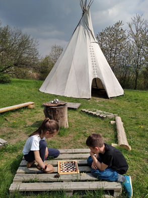 Zázemím dětského lesního klubu je jurta se zastřešenou terasou a teepee v nádherném starém sadu pod Křížovým vrchem v Rudě u Tvrdkova.